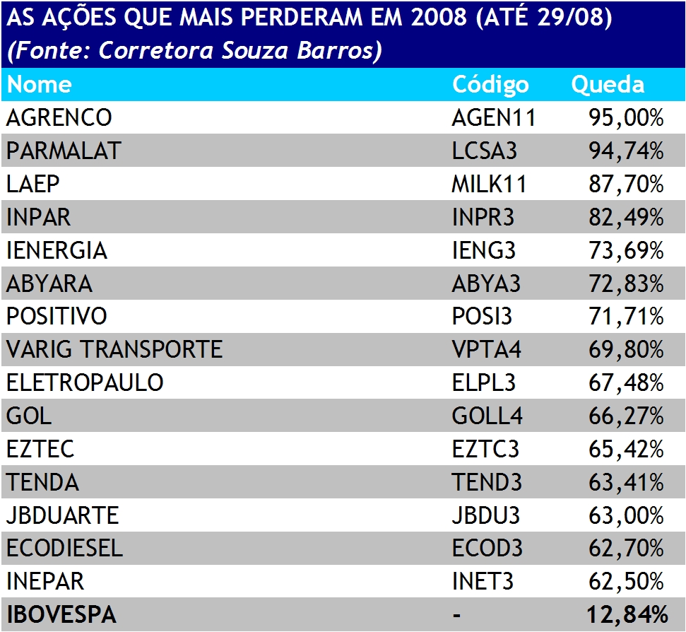 O sobe-e-desce da Bolsa está um teste de resistência para qualquer investidor, mas, para alguns, a situação está ainda mais inquietante. São aqueles que apostaram em ações que têm se revelado verdadeiros micos. Segundo levantamento do economista-chefe da Corretora Souza Barros, Clodoir Gabriel Vieira, alguns papéis têm tido quedas muito superiores às da Bovespa durante este ano. Enquanto a Bolsa havia amargado perdas de 12,84% até o fim de agosto, 15 empresas perderam de 62,5% até 95% do seu valor no mesmo período (veja tabela no fim deste texto).