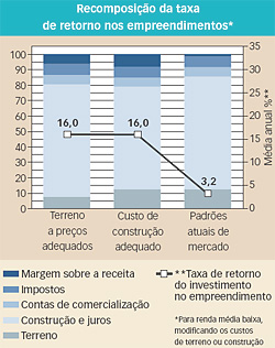 Um redutor próximo dos 40% nos preços dos terrenos, frente aos atuais, leva a taxa de retorno para o patamar dos 16% ao ano e um redutor próximo dos 10% nos custos da construção leva a taxa de retorno ao mesmo patamar.