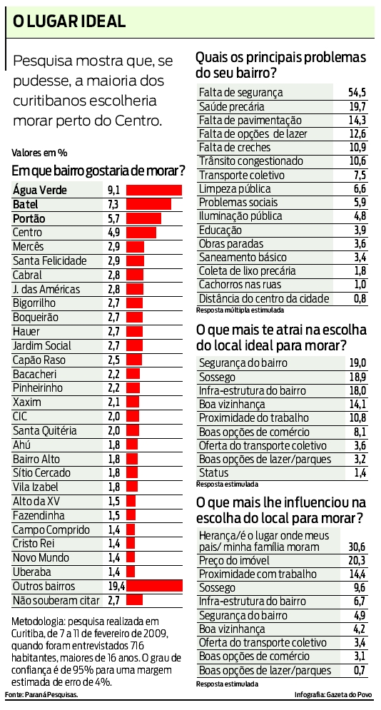 O estudo mostrou que mais de um quarto dos curitibanos gostaria de viver nesses bairros ou no Centro (veja infográfico). O líder na preferência é o Água Verde, que foi a opção de 9,08% dos entrevistados. Logo atrás, aparecem o Batel e o Portão, bairros que ficam a menos de seis quilômetros do Centro – quarto colocado na pesquisa.