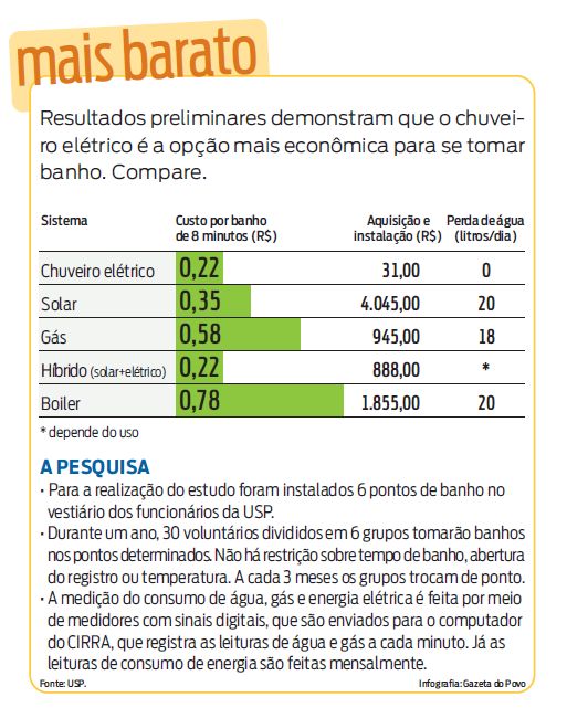 Resultados dos primeiros três meses da pesquisa, que será concluída em um ano, mostram que um banho de oito minutos com chuveiro elétrico custa R$ 0,22 contra R$ 0,35 do sistema solar, R$ 0,58 do sistema a gás e R$ 0,78 do aquecedor de acumulação elétrico (boiler). O sistema híbrido foi o único sistema que teve custo de insumo igual ao do chuveiro elétrico.