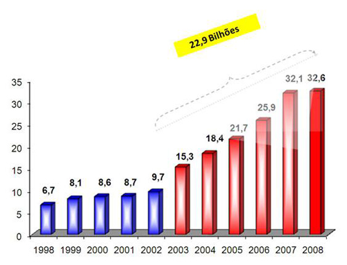 Confira, abaixo, a evolução do total de ativos da Funcef – patrimônio – em bilhões de reais, ano a ano, desde 1998: