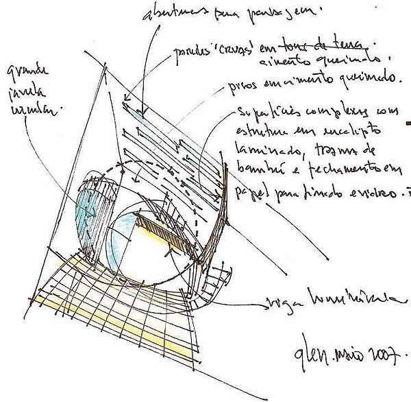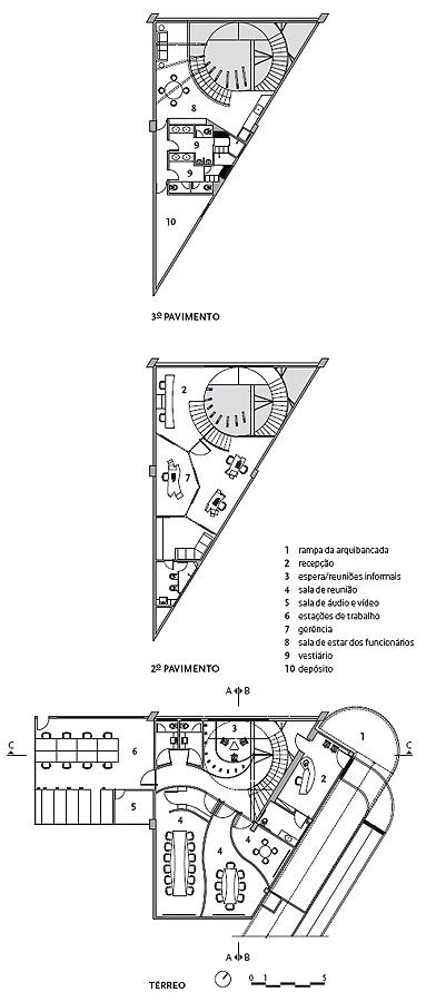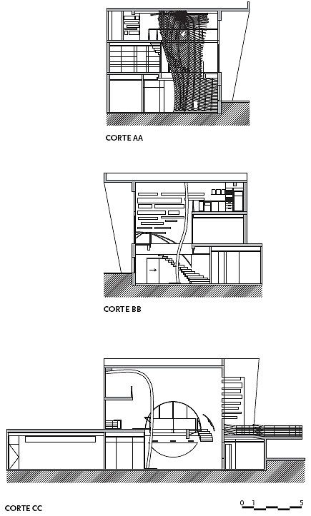 Já a fachada dos fundos era mais alta e segura, mas se abria para um grupo de confusas e precárias construções. O projeto barrou a poluição visual, permitindo a entrada de luz natural por um semicírculo de vidro translúcido de segurança, que definiu esse plano.