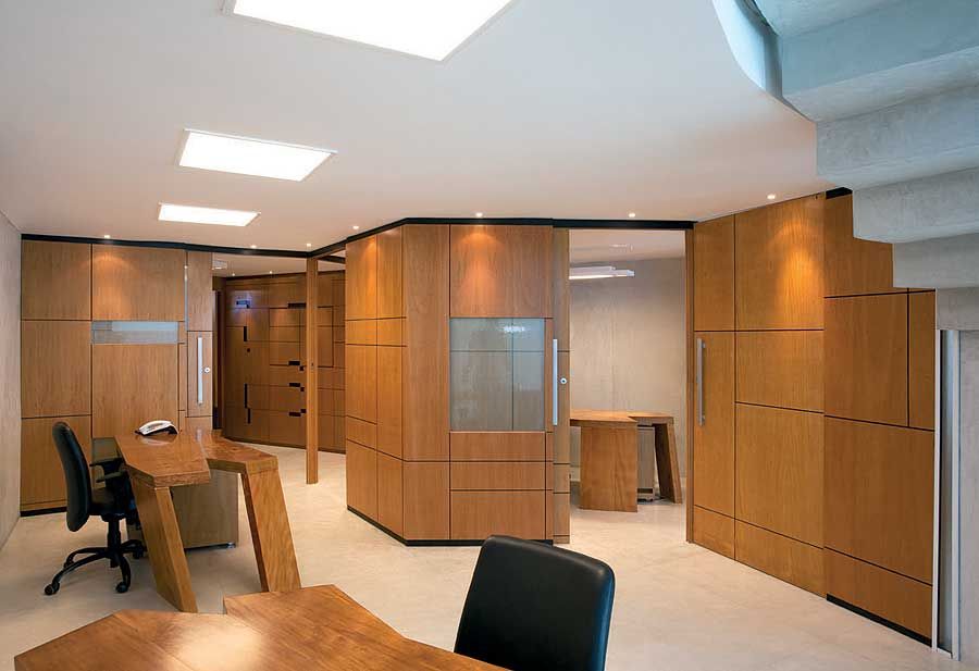 De acordo com os arquitetos, tanto o mobiliário quanto as divisórias, portas e forros acompanham a filosofia de contrastes determinada pela arquitetura. Um trabalho elaborado de marcenaria define as áreas internas de cada pavimento. No primeiro piso, paredes curvas otimizam o espaço irregular. No segundo, como uma colmeia, divisórias de correr formam os ambientes da diretoria, mas possibilitam a sua integração quando necessário. Nos dois pavimentos inferiores, o forro de gesso embute lógica, elétrica e iluminação, e personaliza os espaços com seu desenho criativo.