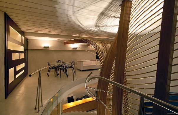 Para driblar o espaço desfavorável e exíguo, o escritório Mareines + Patalano Arquitetura projetou um elemento escultórico tramado de madeira e bambu, marcando a circulação vertical