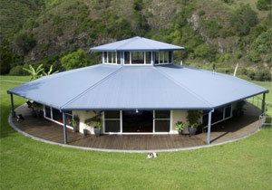A casa é octogonal e está amparada por um grande círculo no chão, que gira movido a motor elétrico conforme a vontade dos donos. Tudo controlado por computador.