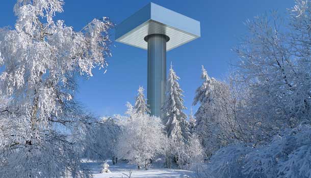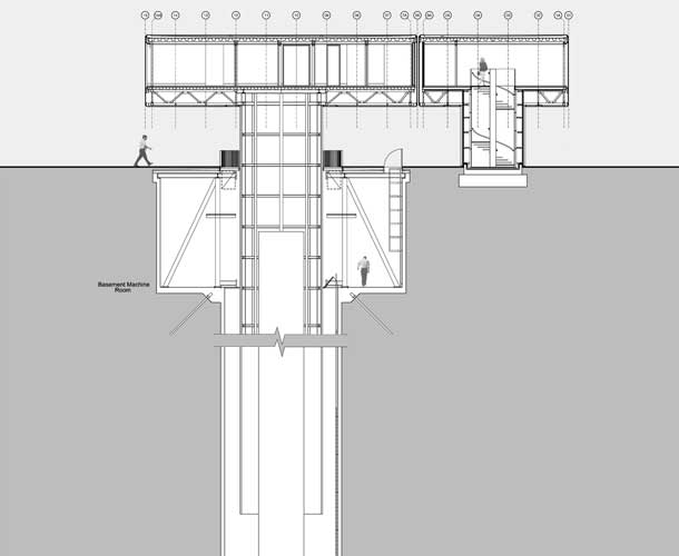A coluna funciona como um suporte com trilhos movidos por oito motores com potência de 22 kW, equivalente a de um carro popular. O aparelho ainda possui 260 t como contrapeso e um motor adicional que, em caso de falha, permite que o mecanismo funcione sem redução de performance. O projeto ainda não saiu do papel. “Estava em fase de detalhamento quando a crise atingiu o Reino Unido e foi colocado em espera por fundos”, explica Guilherme Ressel, um dos arquitetos do Marks Barfield Architects.