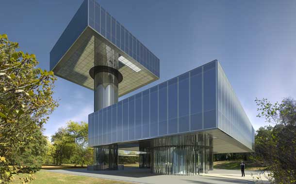 Fachada é composta de vidro triplo, intercalado por uma grelha de metal expandida