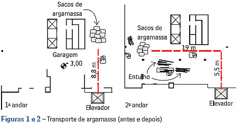 Análise da situação atual – Transporte de argamassa: o primeiro ciclo observado foi o transporte de argamassa ensacada. Para transportar a argamassa até o local de utilização são percorridos no total 42,00 m, assim subdivididos: 8,80 m a distância percorrida no primeiro andar (lugar de estocagem da argamassa até o elevador), 24,50 m a distância percorrida no segundo andar (do elevador ao local de aplicação da argamassa) e 8,70 m é o percurso vertical realizado pelo elevador de obras. As distâncias horizontais podem ser observadas nas figuras 1 e 2. Para cada ciclo, são transportados dez sacos de argamassa, exigindo o esforço de três homens.