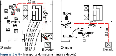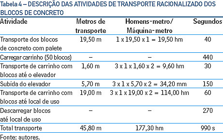 Na tabela 2 observam-se as distâncias percorridas em cada etapa do transporte e o respectivo esforço humano em homens-metro e o tempo gasto em segundos. Durante a observação e registro dos tempos gastos, verificou-se um excesso de tempo de espera. Enquanto os dois operários faziam o carregamento de blocos na girica, transportavam e descarregavam os blocos até o local de uso, o operário que transportava o palete até o elevador permanecia esperando até que se esvaziasse completamente o palete e ele pudesse buscar outro. Esse tempo de espera representou 95% do tempo total da atividade e indica uma grande oportunidade de racionalização.