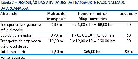Na tabela 1 é possível observar o esforço em homens-metro e máquina-metro em cada fase do transporte da argamassa e o respectivo tempo gasto em segundos. As unidades selecionadas para esse ciclo, em segundos, foram: homens-metro e máquina-metro.