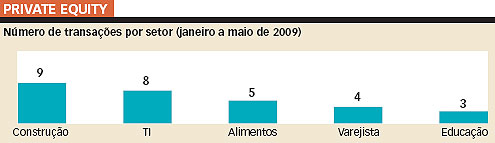 Em meio à escalada dos investimentos, a construção civil se sobressai com participação de 17% no volume investido entre 2005 e 2008, a terceira maior segundo o panorama do GVcepe. A presença das empresas do setor no portfólio das organizações gestoras também decolou: de nove para 60 companhias entre 2004 e 2008, um aumento de 567%, o mais expressivo entre os 25 setores analisados pela pesquisa. Aparentemente, nem mesmo os solavancos da crise econômica abalaram o interesse dos investidores. Segundo estudo concluído em junho de 2009 pela consultoria PricewaterhouseCoopers, das 50 transações de private equity realizadas entre janeiro e maio daquele ano, nove foram destinadas ao setor da construção, o que o coloca em primeiro lugar no ranking do período (veja gráfico).