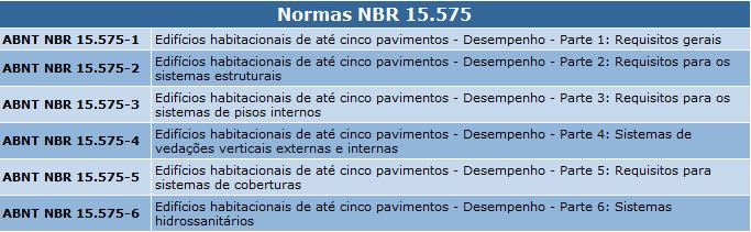 As normas ABNT NBR 15.575 são as primeiras do país a estabelecer parâmetros que permitem avaliar o desempenho de edificações. Dirigidas a prédios habitacionais de até cinco pavimentos, também devem se tornar referência dos contratantes para outros tipos de edifício. Entre as novidades, elas definem responsabilidades dos agentes envolvidos, do incorporador ao usuário, e trazem novos parâmetros de projeto e especificação.