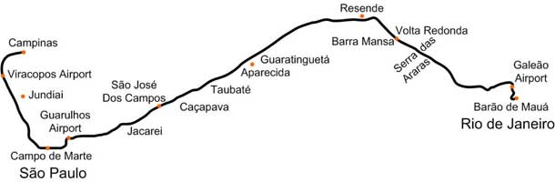 No estudo da Halcrow, o traçado de 511 km começa na cidade de Campinas e passa pelas cidades de São Paulo, Guarulhos (SP), São José dos Campos (SP), Volta Redonda/Barra Mansa (RJ) até chegar ao Rio de Janeiro. O estudo também considerou a criação de estações intermediárias em Resende (RJ), em Jundiaí e Aparecida do Norte (SP).