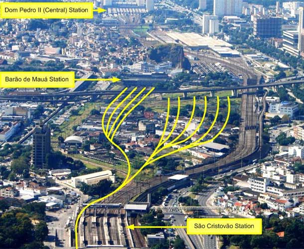 Definido o traçado referencial, a empresa britânica passou a estudar os melhores locais para a construção das estações nas cidades. No Rio de Janeiro, optou-se por aproveitar a estação em desuso de Barão de Mauá (Leopoldina), situada proximamente a estação do metrô Dom Pedro II. “Barão de Mauá foi escolhido para permitir que os passageiros de TAV e do Metrô sejam mantidos separados, mas, ao mesmo tempo, possam fazer o intercâmbio entre as duas linhas”, diz o documento.