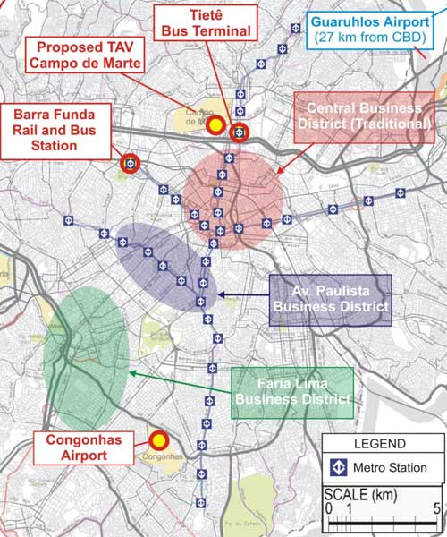 Já em São Paulo, segundo o estudo, a situação foi mais complexa. Inicialmente, a Halcrow analisou as regiões da Luz, no centro, e da Barra Funda, na zona oeste da cidade. Porém, em ambos os casos, não há espaço suficiente para a construção da estação. Os engenheiros optaram, então, pela região do Campo de Marte, na zona norte de São Paulo. “O tamanho de sua área e a possibilidade de adquiri-la com mais facilidade fez o Campo de Marte se tornar um local atrativo para uma estação do TAV”, explicam os engenheiros no documento.