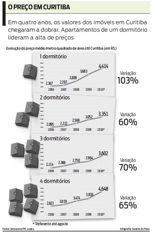 Mesmo com a disparada dos preços – o metro quadrado aumentou entre 60% e 100% nos últimos quatro anos –, as empresas acreditam que ainda há uma demanda ávida por novidades. Pelos cálculos de Marcos Kahtalian, da Brain Consultoria, Curitiba tem mercado para absorver entre R$ 2,5 bilhões e R$ 3 bilhões em lançamentos de imóveis por ano. “Somente a partir de meados de 2011, quando também deve ser entregues um número significativo de imóveis, é que saberemos se o mercado vai continuar crescendo nessas proporções”, afirma.