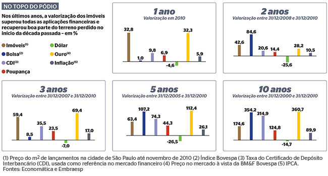 No Brasil, os preços dos imóveis também não se descolaram dos outros ativos, como no exterior. A valorização estaria apenas compensando o período em que eles subiram menos que as demais aplicações, nos anos 90 e na primeira metade dos anos 2000. Num período de dez anos, os imóveis ainda ofereceram um ganho menor que a Bolsa e outras aplicações. “Fazia tempo que os preços não se moviam, até por causa dos juros altos”, diz José Roberto Machado, diretor de crédito imobiliário do banco Santander.