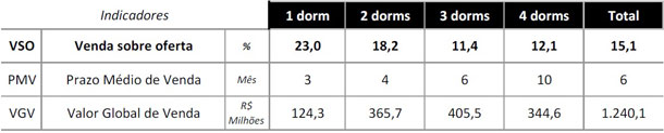 O volume de venda de apartamentos de dois dormitórios cresceu 32,8%, com destaque para bairros tradicionais como Morumbi e Brooklin, além dos subdistritos Belém, Tucuruvi e São Miguel, com diversificação de produtos desde empreendimentos econômicos até os de classe média. Ao todo, as vendas de unidades com dois dormitórios representou 45,5% do total comercializado (1.085 unidades) e 26,7% corresponderam a unidades de três dormitórios (635 unidades).