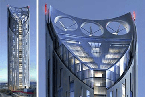 O Strata Building, em Londres, é um edifício de 42 andares em Londres e obtém 8% de seu consumo de energia das três turbinas eólicas instaladas em sua cobertura. Elas devem gerar até 50 MWh de eletricidade por ano.