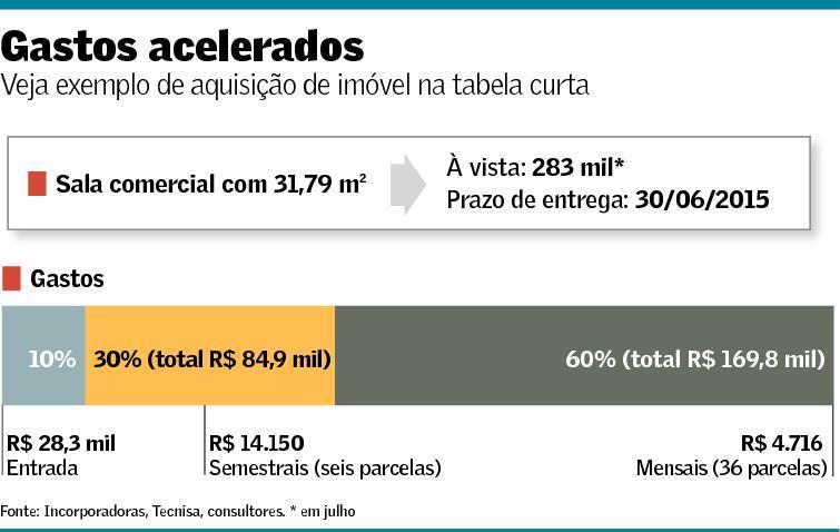Na tabela curta, o comprador pode negociar a melhor forma de parcelamento, desde que dentro do prazo de construção. Em geral, costuma-se pagar entrada de 10% a 12%, e dividir o restante ao longo do período, com 60% do saldo a ser quitado por meio de mensalidades e 30% em semestrais extras. Para ilustrar, em uma obra de dois anos, o comprador de um imóvel de R$ 100 mil poderia desembolsar R$ 10 mil no ato e financiar o restante em 24 parcelas de R$ 2,5 mil, além de quatro semestrais de R$ 7,5 mil cada.