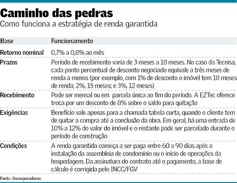 Esse modelo, conhecido como renda garantida, ressurgiu recentemente por iniciativa das companhias paulistanas EZTec e Tecnisa e da mineira Patrimar. A estratégia consiste em transformar um eventual desconto na venda em uma espécie de “aluguel” pago pela incorporadora ao cliente por um prazo específico, por exemplo, 12 a 18 meses, depois da entrega da obra.