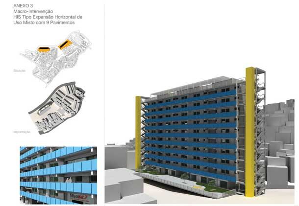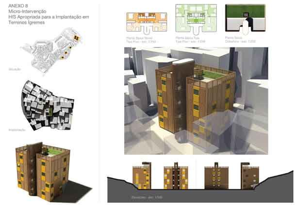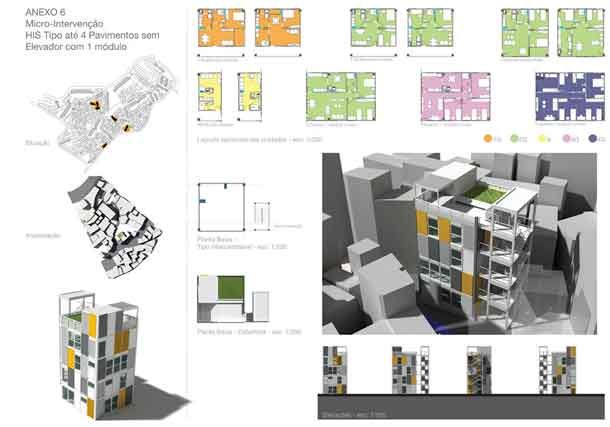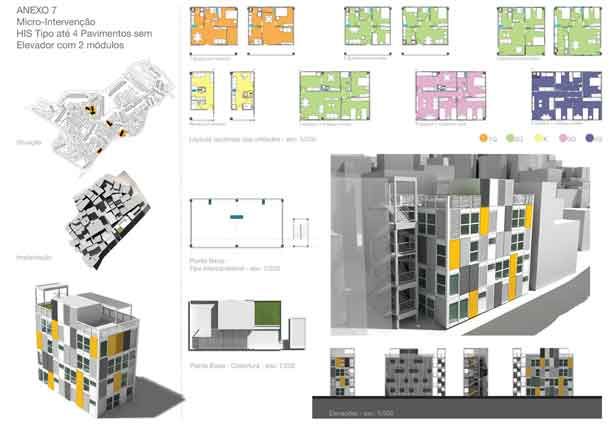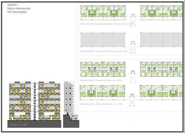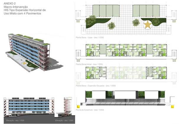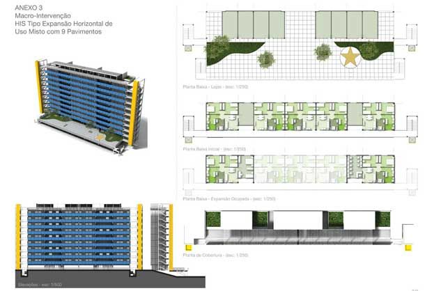 O projeto contempla a implantação de habitações com programas variáveis, com apartamentos que oferecem de um a quatro quartos, e HIS evolutivas, que permitem o remanejamento dos layouts e expansão controlada das unidades. Já os outros modelos propõem edificações com uso misto, combinando o módulo habitacional ao de serviços, circulações verticais e horizontais de uso público e pavimentos em pilotis das habitações que se dividem entre espaços públicos e semi-públicos, como galerias cobertas, equipamentos, comércio e lazer.