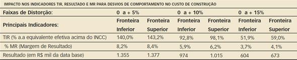 O quadro 3 apresenta o intervalo de valores dos indicadores com alto grau de confiabilidade (90%) para as diferentes faixas de distorção do custo de construção. Os resultados confirmam a sensibilidade desses empreendimentos para desvios de comportamento nessa variável [custo de construção]. Uma distorção na faixa de 0 a 5% já levaria a MR para o intervalo de 8,2% a 8,4%. Para a distorção na faixa de 0% a 15%, a MR seria significativamente baixa [3,7% a 4,1%] mesmo para uma TIR ainda expressiva [51,9% a 59,0% a.a].