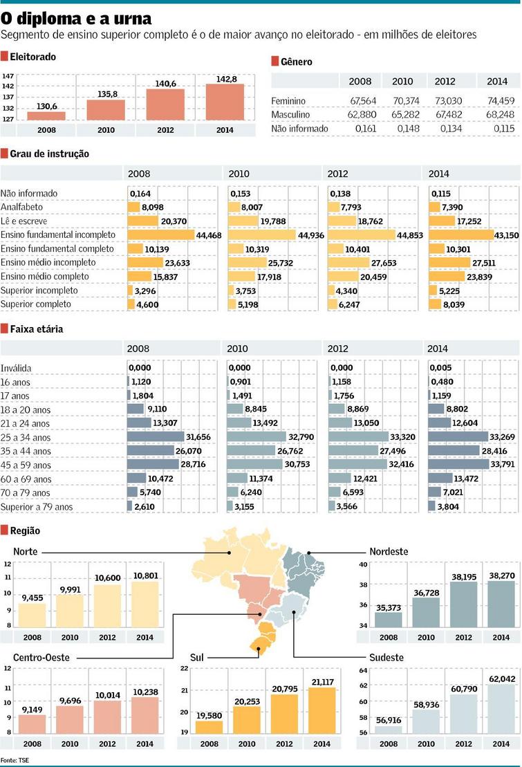 Pela primeira vez, o Brasil terá mais eleitores com ensino superior completo que analfabetos. O balanço oficial do Tribunal Superior Eleitoral (TSE), apresentado nesta terça-feira (29), mostra que nas eleições de 5 de outubro, votarão 8 milhões de graduados. Os analfabetos somam 7,4 milhões. Na últimas eleições gerais, em 2010, participaram da disputa 6,2 milhões de formados em universidades, enquanto o número de pessoas que não sabem ler nem escrever era de 7,8 milhões. No total, o país terá 142,8 milhões de pessoas aptas a votar, um crescimento de 5,17% em relação a 2010, quando a quantidade de eleitores era de 135,8 milhões.