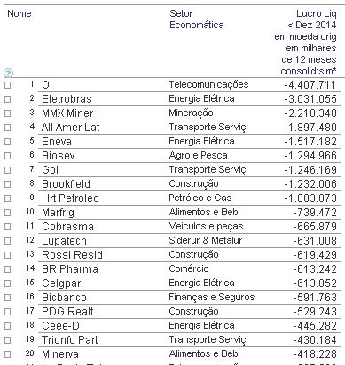 As construtoras Brookfield, Rossi e PDG Realty estão entre as empresas de capital aberto que apresentaram os maiores prejuízos em 2014, de acordo com levantamento da consultoria Economática. Além do setor da construção civil, o de energia elétrica registrou as maiores perdas participando com as companhias Eletrobras, Eneva, Celgpar e Ceee-D. O maior prejuízo registrado em 2014 pela pesquisa, no entanto, foi o da Oi, do setor de Telecomunicações, com lucro líquido negativo em R$ 4,40 bilhões.