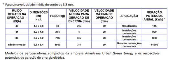 Com uma vida útil de projeto de 20 anos, a empresa Americana Urban Green Energy (UGE) possui quatro modelos básicos de aerogeradores compactos de eixo vertical, com as seguintes características: