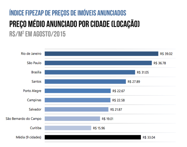 Em agosto de 2015, o retorno médio anualizado com aluguel foi de 4,7%. O preço médio anunciado para locação por m² nas nove cidades pesquisadas em agosto de 2015 foi de R$ 33,04/mês. A cidade com o m² mais caro foi o Rio de Janeiro (R$ 39,02/mês), seguida por São Paulo (R$ 36,78/mês). O aluguel mais barato foi em Curitiba (R$ 15,96/mês).