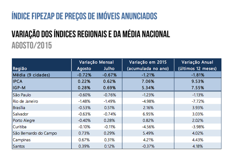 No mesmo período a variação do Índice de Preços ao Consumidor Amplo (IPCA) foi positiva em 0,22%. Após o resultado negativo de agosto, o índice de locação passou a mostrar queda de 1,21% no resultado do ano de 2015. Quando analisado o período de doze meses encerrados em agosto, a variação do Índice FipeZAP de Locação foi de -1,81%, a maior queda da série histórica.