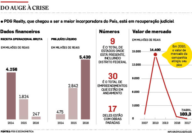 No mercado, há ceticismo em relação à recuperação plena da empresa, que chegou a ser avaliada em Bolsa em R$ 14 bilhões, em 2010, e hoje vale R$ 103 milhões. Em 2016, a PDG encerrou com prejuízo líquido de R$ 5,43 bilhões. O patrimônio líquido ficou negativo em R$ 3,4 bilhões. Ou seja, o valor das obrigações é superior ao dos ativos.
